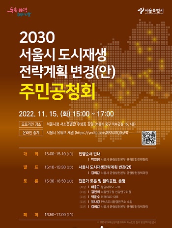11월 15일(화) 오후 3시 서울시청 후생동 강당에서 일반시민·전문가·공무원 등이 참여하는 ‘2030 서울시 도시재생 전략계획 변경(안)’ 공청회가 열린다.