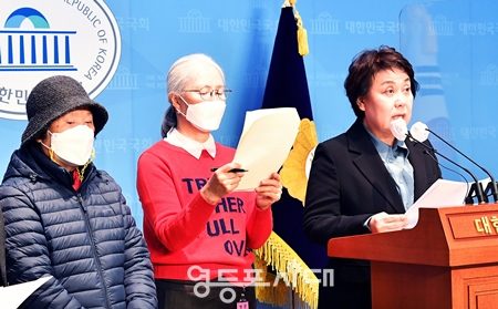 민주당 정춘숙 국회의원(사진 오른쪽)은 16일 국회 소통관에서 기자회견을 열고 ‘미군 위안부 문제에 대한 진상규명 및 지원 등에 관한 법률’ 제정을 촉구했다. 9월 29일 대법원은 8년 3개월 만에 122명의 원고가 제기한 ‘기지촌 미군위안부 국가손해배상청구소송’에서 국가의 책임을 인정한 최종 판결을 했다. 정춘숙 의원은 이날 기자회견에서 “국가의 책임을 인정한 대법원판결이 내려진 이상, 더 이상 국회는 특별법 제정을 미루지 않을 것이다”라며 “이젠 제대로 된 진상규명과 지원을 규정하는 특별법 제정으로 우리 국회가 응답할 때다”라고 강조했다. 1심에선 국가의 책임을 일부 인정, 2심 판결에서는 1심 판결인 위법한 강제 격리수용 행위뿐만 아니라 국가가 기지촌 운영 및 관리과정에서 기지촌 미군 위안부였던 원고들을 상대로 성매매 정당화와 조장 행위를 인정했다. 항소심은 기지촌 운영에서 보건부, 경기도, 용산경찰서장, 춘천시 등 피고인 국가 공권력이 작성한 공문을 근거로, 국가가 나서서 ‘주한미군을 고객으로 하는 접객업소의 서비스 개선,’ ‘애국 교육 시행,’ 등 성매매를 조장· 정당화하는 위법행위가 있었다고 인정했다. 대법원은 2심 판결을 그대로 받아들여 피고는 원고들에게 국가배상법 제2호 제1항에 따라 이로 인한 손해를 배상할 의무가 있다”라고 판결했다. 정춘숙 의원은 “1945년 9월 8일 이후 단 한 번도 국가 차원에서 조사된 바 없는 주한미군 기지촌 미군 위안부들이 겪은 인권침해 사건 조사와 진상규명과 명예 회복, 그리고 지원을 위해서는 특별법이 필요하다”라고 강조했다.