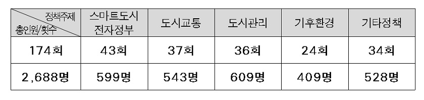 2,688명의 참가자 중 도시관리정책에 609명이, 스마트도시 및 전자정부에 599명, 도시교통정책 연수에 543명이 참가하여, 외국 공무원이 서울에서 배우고 싶은 대표적인 정책분야가 이 3가지임을 유추할 수 있다.
