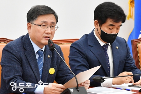 김성환 정책위의장(사진 왼쪽)은 “5일까지 2023년 예산안 관련 ‘2+2 협의’가 있었으며 예결위 과정에서 쟁점이 되었던 사안 중에 일부는 진전이 있었다”라면서도 “민생 회복을 위한 예산 등 여러 가지 쟁점이 여전히 많이 남아있다”라고 밝혔다.