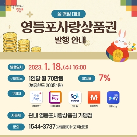 영등포구가 설 명절을 앞두고 소비자의 부담을 완화하고 지역경제 활성화를 위해 ‘영등포사랑상품권’을 130억 원 규모로 발행한다고 17일 밝혔다.