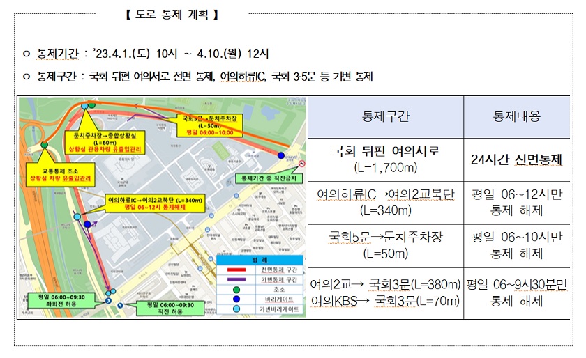 여의나루역 등 승객 밀집 등 안전이 우려되는 상황이 발생할 경우 무정차 통과를 실시하고, 경찰 및 행사 기관 등과 핫라인을 구축해 지상 이동 승객 동선을 유도하는 등 혼잡도를 분산하도록 관리한다. 여의도 주변도로의 불법 주‧정차도 단속한다. 다만 계도 위주로 단속하되, 불응 시 과태료 처분 및 견인 조치를 실시한다. 윤종장 서울시 도시교통실장은 “4년 만에 여의도 봄꽃축제가 재개되는 만큼 안전한 관람을 위해 시민 편의 지원에 최선을 다하겠다”며 “가급적 대중교통을 이용하시기 바라며, 질서를 유지해 축제를 즐기시기를 당부드린다.”고 말했다.