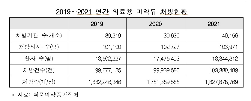 식약처가 발표한 2021년 의료용 마약류 취급현황 통계에 따르면 우리나라 의료용 마약류 처방 환자 수는 1,884만명(중복 제외)으로 국민 약 2.7명 중 1명이 의료용 마약류를 처방받은 셈이다.