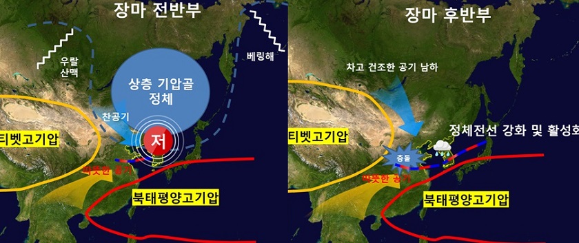 기상청에 따르면 올해 장마의 특성은 전반부와 후반부의 뚜렷한 강수 특성 차이로는 전반부(6월 25일 ~ 7월 12일)에는 정체전선상에서 발달한 중규모 저기압과 대기 불안정에 의한 잦은 강한 비가 내렸던 반면, 후반부(7월 13일 ~ 7월 25일)에는 중부와 남부를 오르내리는 정체전선에 의해 지속성 있는 강하고 많은 비가 내렸다.