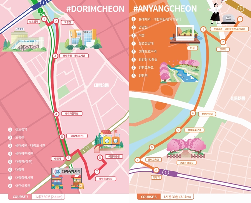 도림천 물길 코스는 ‘하천에서 꽃피는 문화 다양성’을 주제로 ‘신도림역 → 도림천 → 생태공원‧대림도서관 → 생태 하천 복원 → 대림역(하천) → 대림역 → 대림중앙시장 → 어린이공원’이 도림천을 따라 연결된다. 유수지를 복개해 조성한 생태공원, 도림천의 다양한 동‧식물, 한국 속의 작은 중국인 대림중앙시장 등을 살펴볼 수 있다. 특히 복원이 진행 중인 생태 하천과 다문화의 메카인 대림동의 모습은 도보여행을 한층 특색있게 만들어준다. 도림천 물길 코스는 총 2.4km 구간이며, 1시간 30분이 소요된다. 영등포구는 새로운 코스 개발에 따라 해설 시나리오를 제작하고 관광해설사의 역량을 강화하기 위한 전문 교육을 시행했다. 또한 리플릿 제공, 숏폼 영상 게시 등 도보여행 홍보에도 집중한다. 최호권 영등포구청장은 “지역의 우수한 관광자원을 기반으로 도심에 새로운 활력을 채울 수 있는 도보여행 코스를 개발했다”라며 “많은 분께서 도보여행에 참여해 영등포의 유구한 역사와 문화, 계절마다 달라지는 풍경, 지역별 다채로운 매력을 느끼며 영등포에 한층 더 가까워지길 바란다”라고 말했다.