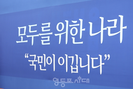 민주당 원내대표 회의실 백보드가 ‘모두를 위한 나라’ “국민이 이깁니다”로 바뀌었다.