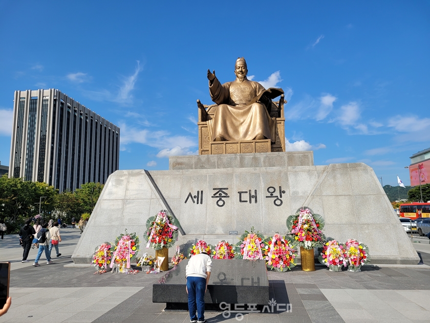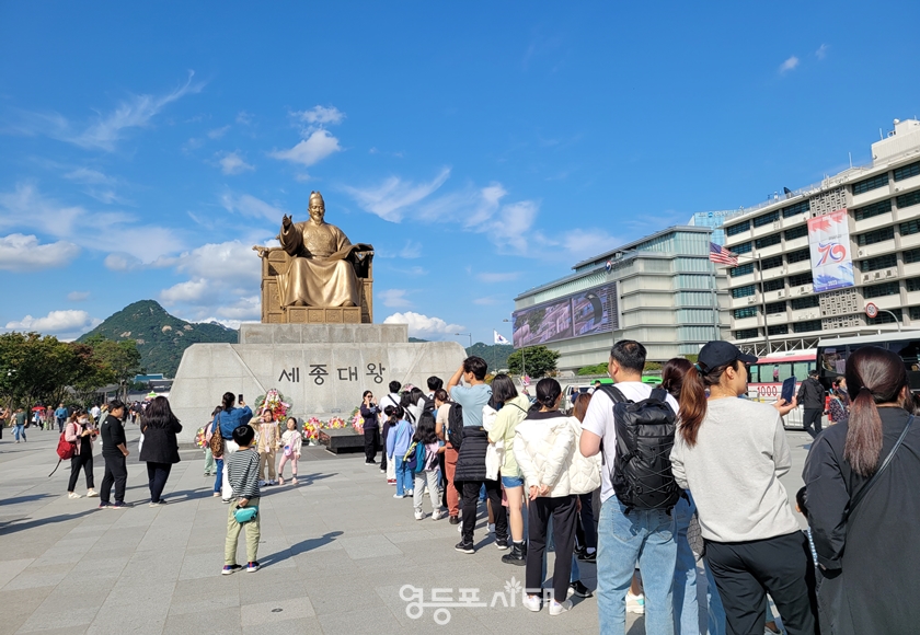 제577돌 한글날을 맞은 10월 9일 오후 광화문 광장에 있는 세종대왕상 앞에서 기념사진을 찍기 위해 줄을 지어 길게 늘어서 있다.