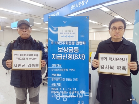 2015년 7차 보상 이후 8년 만에 재개되는 이번 신청은 12월 31일까지 진행된다. 이번에 진행되는 제8차 보상자 신청 명단에 어떤 인사들 신청할지 관심이 쏠리는 가운데 영화 택시 운전사 실존 인물 故 김사복 씨 장남 김승필 씨와 5•18 당시 YMCA에서 시민군으로 활동하던 중 위르겐 힌츠페터 기자를 안내했던 김승현 씨가 11월 27일 접수해 관심이 집중된다. 김승현 씨는 “5.18 당시 국내 언론의 ‘폭도’라는 보도에 분노해서 외신에라도 진실이 전달되기를 바랐다”라며 “수습 대책위원회에서 사진 촬영을 못 하도록 지시가 있어 김사복 씨와 비슷한 일본 NHK 기자는 YMCA 1층에 대기하도록 했고, 힌츠페터 기자만 옥상으로 안내했다”라고 밝혔다. 영화 택시 운전사는 1천2백만 명이 넘는 폭발적 흥행을 기록하며 5•18민주화운동의 진실을 알리는 데 큰 역할을 한 것으로 평가된다. 영화를 관람한 관객들은 이구동성으로 “김사복 씨야말로 사선을 넘나들며, 국제사회에 5•18의 진실을 알리도록 역할을 자임한 분이다”라며 “광주시민을 지킨 진정한 5•18 유공자다”라고 평가한 바 있다. 현재 5•18민주화운동 서울기념사업회 홍보대사를 맡고 있는 신청자 김사복 씨의 장남 김승필 씨는 “아버지의 5•18민주화운동 과정의 활동 내용이 면밀하게 심의되어 정당한 평가가 이루어지기를 바란다”라는 바람을 전했다.