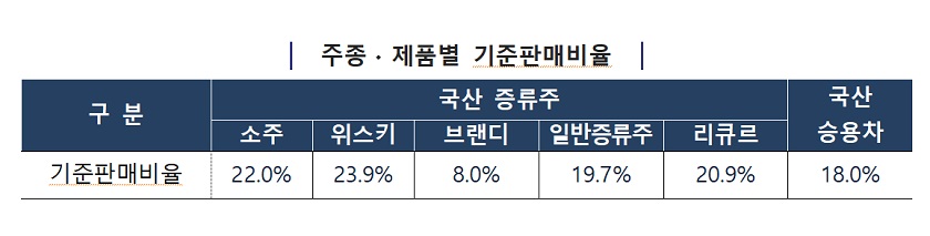 당초 소주 제조사들은 2024년 1월부터 공장출고 가격을 인하할 예정이었으나, 대부분의 제조사가 소비자 부담 완화 및 물가안정에 적극 동참하기 위해 2023년 12월 중에 선제적으로 인하했다. 아울러, 국세청은 “제조사의 가격 인하 효과가 유통사 및 소비자 판매가격으로 이어질 수 있도록 현장소통을 강화하고 있다”라고 밝혔다. 국산 승용차는 2023년 7월 1일부터 기준 판매 비율이 시행되면서 그랜저 기준(출고 가격 4,200만 원 기준, 개별소비세 5% 적용 시) 54만 원이 인하되었으며, 기준 판매 비율 시행에 맞춰 자동차 제조사에서도 무이자․저금리 할부 혜택, 즉시 출고차에 대한 할인을 적극적으로 실시해 소비자 부담이 완화됐다. 국세청은 “앞으로 발효주류와 기타 주류, 캠핑용 자동차에 대해서도 1월 중 기준 판매 비율심의회 심의를 거쳐 2024년 2월 1일부터 기준 판매 비율을 시행할 계획이다”라고 덧붙였다.
