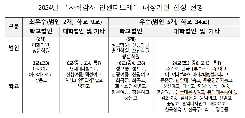 학교법인 7개, 사립학교 43교 선정 서울시교육청, 2024년 ‘사학감사 인센티브제’ 선정 결과 발표