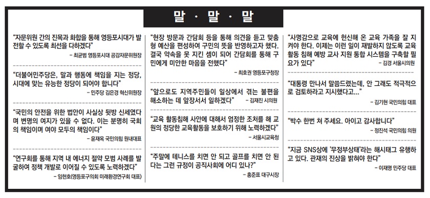 -최균범 영등포시대 공감자문위원장 “더불어민주당은, 말과 행동에 책임을 지는 정당, 시대에 맞는 유능한 정당이 되어야 합니다” -민주당 김은경 혁신위원장 “국민의 안전을 위한 법안이 사실상 뒷방 신세였다며 변명의 여지가 있을 수 없다. 이는 분명히 국회의 책임이며 여야 모두의 책임이다” -윤재옥 국민의힘 원내대표 “현장 방문과 간담회 등을 통해 의견을 듣고 맞춤형 예산을 편성하여 구민의 뜻을 반영하고자 했다. 결국 약속을 못 지킨 셈이 되어 간담회를 통해 구민에게 미안한 마음을 전했다” -최호권 영등포구청장 “앞으로도 지역주민들이 일상에서 겪는 불편을 해소하는 데 앞장서서 일하겠다” -김재진 시의원 “연구회를 통해 지역 내 에너지 절약 모범 사례를 발굴하여 정책 개발로 이어질 수 있도록 노력하겠다” -임헌호(영등포구의회 미래환경연구회 대표) “교육 활동침해 사안에 대해서 엄정한 조처를 해 교원의 정당한 교육활동을 보호하기 위해 노력하겠다” -서울시교육청 “사명감으로 교육에 헌신해 온 교육 가족을 잘 지켜야 한다. 이제는 이런 일이 재발하지 않도록 교육활동 침해 예방 교사 지원 통합 시스템을 구축할 필요가 있다” -김경 서울시의원 “주말에 테니스를 치면 안 되고 골프를 치면 안 된다는 그런 규정이 공직사회에 어디 있나?” -홍준표 대구시장 “대통령 만나서 말씀드렸는데, 안 그래도 적극적으로 검토하라고 지시했다고...”-김기현 국민의힘 대표, “박수 한번 쳐 주세요. 아이고 감사합니다” -정진석 국민의힘 의원 “지금 SNS상에 '무정부상태'라는 해시태그 유행하고 있다. 관재의 진상을 밝혀야 한다” -이재명 민주당 대표 말말말 188호 23. 07. 25일 발행 배포