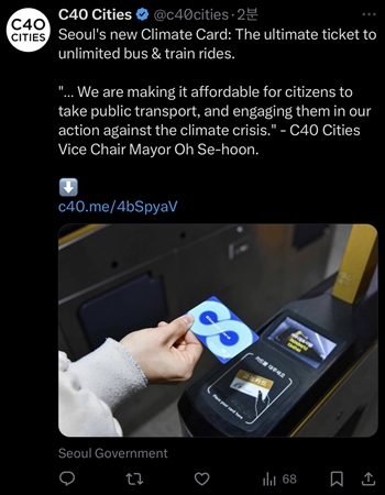 서울시가 올해 1월부터 시범 운영에 들어간 기후동행카드’ 성과가 6월 12일 22시경(영국 기준 12일(수) 14시) C40 도시 기후리더십그룹의 공식 엑스(구, 트위터) 계정을 통해 약 100개 회원 도시에 소개됐다.