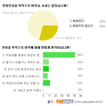 직장인 10명 중 6명은 연봉인상을 목적으로 진행 한 이직을 후회한적이 없으며, 직장생활 중에서 한번의 점프는 꼭 필요하다는 조사결과가 발표되었다. 연봉정보사이트 페이오픈(www.payopen.co.kr, 대표 최효진)은 헤드헌팅 기업 HR코리아와 공동으로 ‘연봉인상을 위한 이직’에 관해 직장인 394명을 대상으로 진행한 설문조사결과를 26일 발표하였다. 이번 설문조사에 참여한 전체 응답자 중 60%의 응답자가 연봉인상을 목적으로 이직을 한 경험이 있다고 답했다. 그렇다면 이직을 통해 가장 높았던 연봉인상률은 몇 %였을까? 설문결과, ‘10%내외’가 24%로 가장 많았다. 이어 ‘20%내외’(20%), ‘15%내외’(14%), ‘5%내외’(11%) 순으로 나타났다. 한편, 연봉인상을 목적으로 이직했을 경우 후회한 적이 있냐는 질문에는 전체 응답자 중 28%만이 후회한다고 답해, 대부분의 직장인은 이직으로 인한 연봉인상에 만족하는 것으로 조사되었다. 연봉을 목적으로 한 이직에 관한 직장인들의 생각은 ‘직장생활 중에 한번쯤 연봉점프는 필요하다’는 답변이 57%로 가장 많았고, 뒤를 이어, ‘직업인으로써 주는 만큼 더 열심히 일하겠다’(13%). ‘현재 직장에서 열심히 일하겠다’(11%), ‘돈이 크게 중요하지는 않다’(11%) 등의 순으로 나타났다. 이번 설문조사는 ‘30대 직장인’(52%), ‘40대 직장인’(34%), ‘50대 직장인’(11%) 순으로 응답했으며, 직급 별로는 과장급(31%), 부장급(20%), 차장급(18%), 대리급(15%) > 임원(11%) 순으로 응답했다. 소득수준은 연봉 3,000만원에서 7,000만원까지 골고루 응답을 했으며, 연봉 8,000만원 만원이 넘는 고소득 직장인들도 16%나 조사에 참여했다.