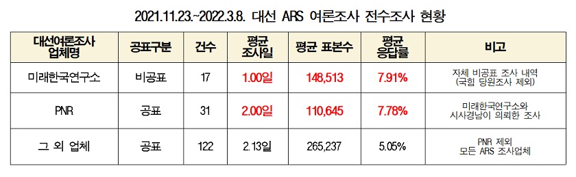 박은정 의원은 이날 기자회견에 앞서 새롭게 공개된 명태균 씨의 녹취로 “(ARS 조사) 땡겼어. 자, 그다음에 진짜 돌아가는 날, 우리도 조사하면 안 되나? (우리가) 상대 지지자한테 전화하지? 그럼 글마는 (공식) 전화 받았다고 하겠지. 그다음에, 자기 전화 받았다고 (착각하는데 공식) 전화 받(겠)나?” “비행기가 대한항공 타야 되는데 아시아나 탄 놈도 막, 우리한테 받은 놈도 막 다 올려. 개표했는데 대한항공(에는) 반밖에 안 탔네.”를 공개하고 “명태균이 미리 ARS를 돌려서 지지 성향을 확인하고, 공식 여론조사 날에는 방해 조사를 시행해서 여론을 조작할 수 있다는 것으로 해석되는 발언이다”라고 강조했다. 박은정 의원은 “여론조사 조작 의혹을 실토한 명태균의 증언을 토대로 의원실에서는 여론조사 전문가와 함께 미래한국연구소와 PNR이 지난 대선 기간에 수행한 ARS 여론조사를 분석했다. PNR과 미래한국연구소 외의 같은 기간 ARS 대선 여론조사들도 전수조사하여 비교한 결과라는 점”을 미리 밝혔다. 2021년 11월부터 대선이 있던 2022년 3월까지, 윤석열 후보에게 유리한 결과를 보였다는 미래한국연구소의 비공표 여론조사 소요일은 모두 하루였습니다. 같은 기간 공표 여론조사들의 평균 조사 일수가 PNR은 2일, 그 외의 업체들은 2.13일이었던 반면 미래한국연구소는 불과 몇 시간 만에 조사를 끝내기도 했습니다. 박은정 의원에 따르면 무작위로 전화번호를 추출하고 표본으로 삼는 RDD 방식의 여론조사에서 명태균 실소유 의혹 미래한국연구소와 시사경남이 의뢰하여 PNR이 수행한 조사는 같은 기간 여타 여론조사의 42%에 불과한 표본으로 1.5배 이상의 더 높은 응답률을 보이는 것으로 드러났다. 명태균이 적은 표본으로도 높은 응답을 끌어내는 여론조사의 신이었는지, “보정이 아니라 조작이었다”는 법사위 국감에 출석한 강혜경 씨 증언대로 윤석열 후보에게 조작 여론조사가 보고된 것인지, 사실관계 확인을 위한 수사가 시급하다.