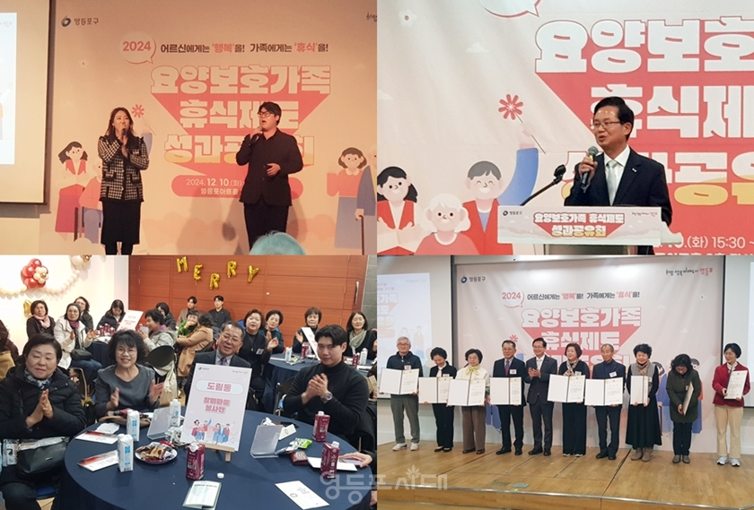영등포구는 12월 10일 영등포 아트홀에서 영등포구 돌봄봉사단과 최호권 영등포구청장, 구의원 등 150여 명이 참석한 가운데 ‘요양보호가족 휴식제도’의 성과 보고회를 개최했다. 이날 열린 성과 보고회에서는 지난 2년의 성과 공유를 넘어 전국 복지 모델로 자리 잡을 수 있도록 발전 방향을 모색하기 위해 열렸다. 오후 3시 30분부터 시작한 성과 공유회는 ▲사업 추진 경과와 성과 발표 ▲우수 돌봄 봉사자 표창 수여 ▲사업 이용 어르신과 가족의 인터뷰 영상 상영 ▲봉사단의 활동 소감 발표 ▲동별 활동 영상 순으로 진행됐다.
