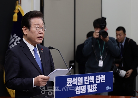 이재명 대표는 12월 13일 국회에서 발표한 성명을 통해 “잠들지 못하는 저항의 밤이 이어지고 있다”라며 “해가 뜨고 지지만 국민의 마음속에 12월 3일 악몽은 아직 끝나지 않았고, 아침이 오지 않았다”라며 이같이 강조했다. 이재명 대표는 “지금 5천만 국민은 무도하고 광기 어린 ‘내란 세력’에 맞서 자신의 평범한 일상을 회복할 장엄한 싸움을 시작했다”라며 “무뢰배가 짓밟은 우리의 민주주의를 국민 여러분께서 지켜내고 있다”라고 감사의 인사를 전했다. 이재명 대표는 이어 “어제 대통령 윤석열은 국민을 향해 광기의 ‘선전포고’를 감행했다. 추악한 거짓말로 범죄를 덮으려 했다. 한시도 직무를 수행할 능력이 없음을, 한시도 직무를 수행해서는 안 됨을 ‘셀프 인증’했다”라고 주장했다. 이재명 대표는 “국민의 명령은 ‘내란수괴’ 윤석열은 지금 당장 물러나라는 것, 단 1분 1초도 국민을 섬기는 1호 머슴 대통령의 자리에 앉아 있어선 안 된다는 것이다”라며 “민주당은 그 준엄한 명령에 따라 내일 대통령 탄핵소추안 두 번째 표결에 돌입한다”라고 밝혔다.