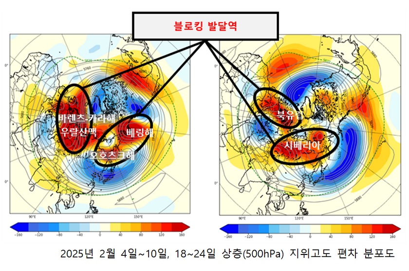기상청(청장 장동언)이 3월 5일 오후 발표한 2024년 12월~2025년 2월(겨울철) 기후 특성과 원인에 관한 분석 결과에 따르면 이같이 나타났다. 1월에는 북극진동으로 인해 10일 전후 대륙고기압과 상층 찬 기압골 영향으로 한파가 발생했으나, 13일 이후에는 따뜻한 이동성고기압의 영향을 자주 받으면서 기온이 크게 올랐다. 이어 2월에는 북대서양 폭풍 저기압의 북극 유입으로 인한 우랄 블로킹 발달 등의 영향으로, 봄이 온다는 입춘(3일부터 10일까지)과 얼음이 녹는다는 우수(18일부터 24일까지)에 추위가 각각 일주일 이상 지속됐다. 그 결과 2월 평균기온은 –0.5℃로 평년보다 1.7℃ 낮았고(하위 15위), 최근 10년(2016~2025년) 중 가장 낮았다.