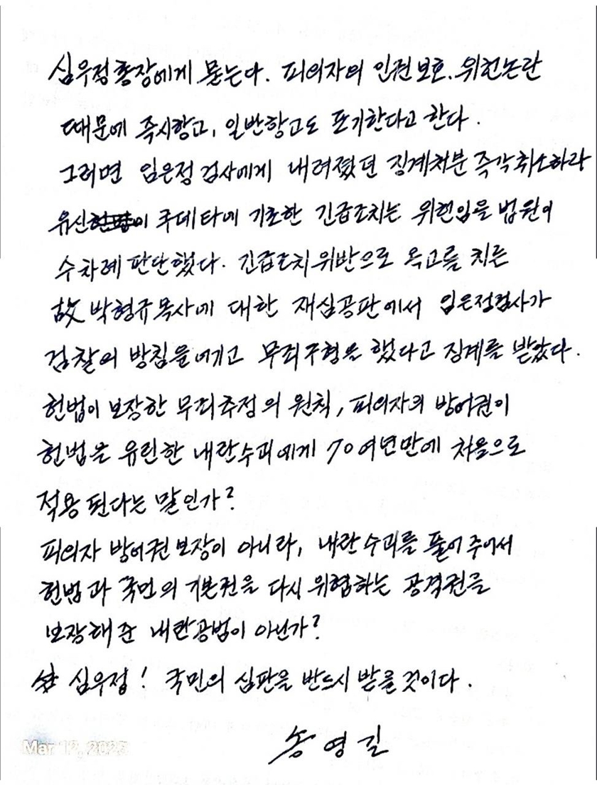 송영길 소나무당 대표는 13일, 측근을 통해 전한 옥중 편지 “심우정 총장에게 묻는다”를 통해 이같이 비판했다. 송 대표는 심우정 검찰총장의 “피의자의 인권 보호, 위헌 논란 때문에 즉시항고, 일반 항고도 표기한다고 한다”라는 말을 꼬집고 “그러면 임은정 검사에게 내려졌던 징계처분 즉각 취소하라”고 요구했다. 송 대표는 이어 “유신 쿠데타에 기초한 긴급조치는 위헌임을 법원이 여러 차례 판단했고, 긴급조치 위반으로 옥고를 치른 故 박형규 목사에 대한 재심 공판에서 임은정 검사가 검찰의 방침을 어기고 무죄 구형을 했다고 징계를 받았다”라면서 “헌법이 보장한 무죄추정의 원칙, 피의자의 방어권이 헌법을 유린한 내란수괴에게 70여 년 만에 처음으로 적용한다는 말이냐?”라고 일갈했다. 송 대표는 그러면서 “피의자 방어권 보장이 아니라, 내란수괴를 풀어주어서 헌법과 국민의 기본권을 다시 위협하는 공격권을 보장해 준 내란 공범이 아니냐?”라며 “심우정 검찰총장은 국민의 심판을 반드시 받을 것이다”라고 주장했다.