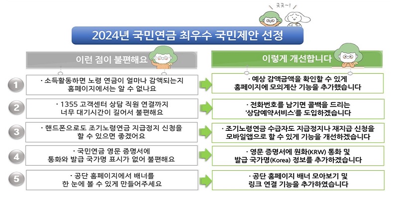한편 이번 최우수 국민제안을 비롯해 그간 개선 내용들은 국민연금 누리집 ‘국민의 소리 반영함’에서 확인할 수 있다. 국민제안에 참여하고 싶은 국민은 국민연금 누리집, 모바일앱, 팩스로 상시 참여할 수 있다.