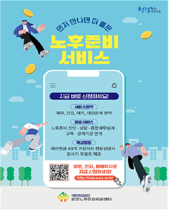 국민연금공단은 개인이 신체·정신·사회·경제 등 전 영역에서 적절한 노후 준비를 할 수 있도록 재무․건강․여가․대인관계 등 분야별로 진단, 상담, 관계기관 연계, 교육 및 사후관리 등 노후준비서비스를 제공하고 있다.