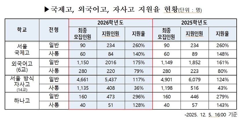 서울시교육청이 12월 5일 발표한 2026학년도 국제고, 외국어고, 자율형 사립고(아래 자사고) 자기주도학습 전형 원서 접수 현황에 따르면 이같이 나타났다. 원서 접수는 12월 3일부터 12월 5일까지 사흘간 이루어졌다. 서울국제고의 2026학년도 입학전형 지원율은 일반전형 2.60:1, 사회통합 전형 1.40:1로 지난해와 비슷한 것으로 분석됐다. 또 서울 지역 외국어고 6교의 2026학년도 입학전형 지원율은 일반전형 1.75:1로 지난해보다 소폭 상승했고, 사회통합 전형은 0.79:1로 지난해와 비슷했다. 서울 방식 자사고 14교(하나고 제외)의 2026학년도 입학전형 지원율은 일반전형 1.17:1, 사회통합전형은 0.36:1로 지난해보다 일반전형과 사회통합 전형 모두 하락했다. 하나고는 일반전형 2.96:1로 소폭 상승했고, 사회통합 전형 1.28:1로 지난해보다 소폭 하락했다. 올해 고입에서는 전년 대비 서울 지역 중학교 3학년 학생 수가 2,823명 증가했고, 자사고였던 대광고의 일반고 전환으로 자사고의 모집 정원은 전년 대비 249명 감소했다.