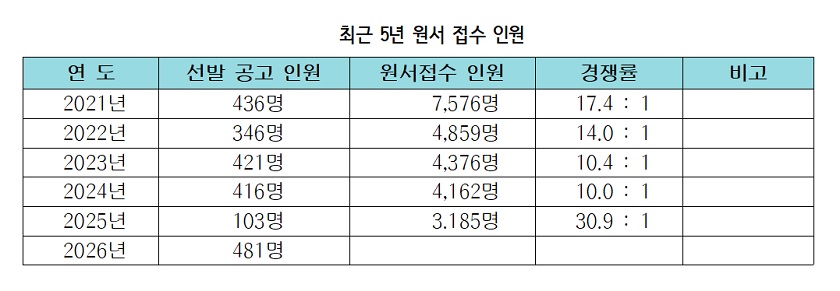 서울시교육청(교육감 정근식)이 3월 3일 공고를 통해 발표한 ‘2026년도 제1·2회 서울특별시교육청 지방공무원 9급 공개(경력)경쟁 임용시험’ 시행 계획에 따르며 이같이 나타났다.