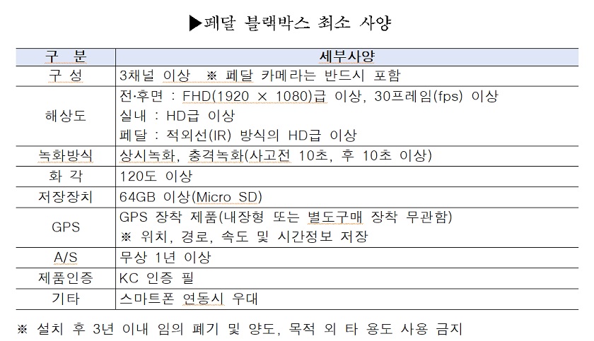지원 대상은 지방보조금관리위원회 심의를 거쳐 4월 중 최종 선정될 예정이며 선정된 사업자는 5~6월 중 서울시가 제시한 최소 사양을 충족하는 페달 블랙박스 제품을 구입, 설치해야 한다.