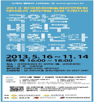 서울특별시금천구시설관리공단(이사장 이옥형)는 문화체육관광부가 주최하고 한국문화예술회관연합회에서 주관하는 2013 문예회관 레파토리 제작개발 지원사업에 선정되어, 일상을 바꾸는 국악예술교육 ‘국악은 내 친구 힐링 난타’ 프로그램을 선보인다.