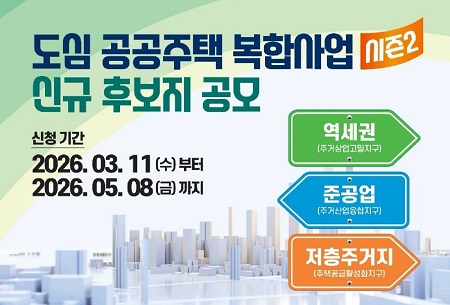 한편, 국토교통부는 도심 공공주택복합사업 시즌2 신규 후보지를 공모한다. 공모 신청은 3월 11일(수)부터 5월 8일(금)까지 받는다.