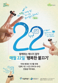 관공서들이 절전의 압박을 받고 있는 가운데 영등포구(구청장 조길형)는 생활 속 에너지 절약 실천을 위해 “행복한 불끄기”캠페인을 전개하고 있다. “행복한 불끄기”란 매월 22일을 “불끄기의 날”로 정해 각 가정에서 저녁 8시부터 9시까지 1시간 동안 전등을 소등해 에너지 절약을 실천하는 범시민운동이다. 이 캠페인은 전기의 소중함을 다시금 깨닫고 절전의 생활화를 도모하기 위해 실시하는 것으로, 최근 원전 가동 중단으로 인해 전기 절약의 필요성은 더욱 커지고 있다. 구는 오는 22일 시행할 “행복한 불끄기” 행사를 적극 홍보하고자 21일 문래근린공원 일대에서 양화중학교 동아리 “에너지수호천사단”, 민간환경단체 ‘그린스타트’와 함께 리플릿을 배포하는 등 홍보캠페인을 실시할 예정이다. 한편 구는 “행복한 불끄기” 캠페인의 일환으로 관내 종사자수 50인 이상 사업장 480여 개를 대상으로 “가정의 날” 참여 행사도 실시한다. “가정의 날”은 기업체에서 자율적으로 매월 1일 이상 날짜를 정해 직원들이 저녁 7시에 이전에 퇴근하도록 해 사무실 전등을 소등하는 캠페인이다. “가정의 날”은 무더운 여름철 에너지 절약을 할 수 있을 뿐만 아니라 직원들에게 충분한 휴식시간을 부여하고 가족과의 친밀도를 상승시키는 계기가 돼 궁극적으로 업무 생산성 향상에도 도움을 줄 것으로 기대된다. 한권직 환경과장은 “최근 원전 가동 중지로 전기 에너지 절약이 그 어떤 때보다 절실히 요구되는 상황인 만큼, 가정과 기업이 에너지 절약 행사에 많이 동참해 국가적 에너지 위기 타개에 힘을 보태주기를 기대한다.”고 밝혔다.
