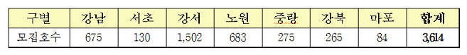 신혼부부 수급자 및 국가유공자에 각 10% 우선공급 강남, 서초, 강서, 노원, 중랑, 강북, 마포 7개구 32개 단지에 총 3,614호의 저소득층 영구임대주택 예비입주자를 모집한다.