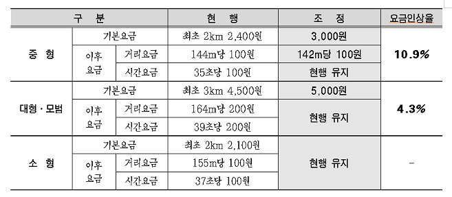 서울시,「서울택시 서비스 혁신 종합대책」발표 서울의 택시요금이 12일(토) 04시부터 조정된다. 그러나 현재 법인택시 1개 업체에서 24대만 운영 중인 ‘소형택시’의 요금은 현행 요금체계 그대로 유지된다.
