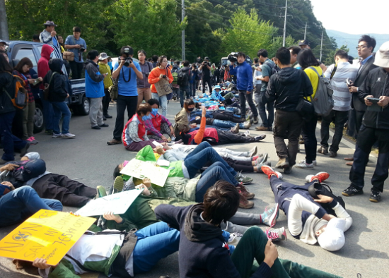 2일(목) 밀양 송전탑 금곡 4공구 현장에서는 공사를 강행하기위해 헬기로 자재를 운반, 이를 저지하기 위해 현장진입을 시도하던 주민 여섯 명이 경찰서로 연행되었으며 주민 연대자들이 도로에 누워 시위를 벌였다.