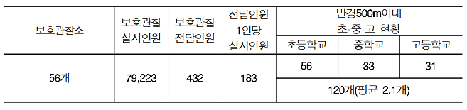 초중고교별로는 초등학교 56개, 중학교 33개, 고등학교 31개 등 총 120개로 보호관찰소 1개당 평균 2.1개의 학교가 근접해 있었다.