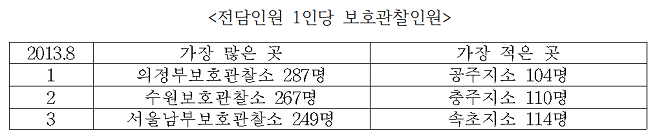 보호관찰 실시인원이 가장 많은 곳은 수원보호관찰소로 3,741명이었으며 가장 적은 곳은 밀양지소로 235명이었으며 전담인원 1인당 보호관찰인원이 가장 많은 곳은 의정부보호관찰소로 287명, 가장 적은 곳은 공주지소로 104명이었다. (2013년 8월 기준)