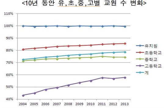 그랬더니 2004년도에 72.5%(35,584명)에 이르던 여성교원의 비율이 꾸준하게 높아져서, 2013년 현재 78.65%(39,457명)에 육박하고 있었다. 하지만, 남성교원은 10년 동안 2,500명 정도 감소했다. 초등학교와 중학교의 여성교원도 꾸준히 증가했지만, 고등학교에서 여성교원의 증가폭이 커졌음을 알 수 있었다. 또한 관리직 여성교원(교장, 교감)의 수도 꾸준히 증가하여, 2004년에 10명 중 2명 수준(23.1%, 468명)이었던 여성 관리직 교원이 현재는 10명중 4명 수준(42%, 888명)이었다. 2004년에 48,078명이었던 교원 수는 2013년에 50,167명으로 약 2,089명이 증가하였다. 전체 교원 수의 변화에 비례하여, 10년 동안 여성 교원은 꾸준히 증가하여 4,588명이 늘었고, 반대로 남성 교원은 꾸준히 감소하여 2,499명이 줄었다. 그 결과 여성교원의 비율은 2004년 72.53%에서 78.65%까지 높아졌고, 10명 중 8명이 여선생님인 상황이 되었다.