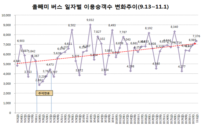 서울시(도시교통본부)는 9.13(금)부터 심야전용 시내버스를 기존 2개 노선에서 9개 노선으로 확대 운행하기 시작한 이후 11.1(금)까지 「올빼미버스 50일 운행 결과」를 발표했다. 먼저 50일 동안 누적 이용인원은 총 30만3,940명으로, 하루 평균 6,079명이 이용한 것으로 나타났다. 이는 하루 평균 버스 1대 당 138명이, 정류소 1개소 당 5.8명(전체 정류소 총 1,056개소)이 이용한 셈이다. 지난 50일 중 가장 승객이 많았던 날은 9,032명이 이용한 10.3(목) 개천절이었고, 가장 적었던 날은 추석 당일이었던 9.19(목) 2,882명이었다. 9개 노선으로 확대 운행한 첫 날인 9.13(금) 4,841명, 첫 번째 토요일인 14일 6,903명이 이용한 이후 승객이 전반적으로 꾸준히 증가하는 추세에 있다. 운행 50일 중에 하루 이용 승객이 8천명이 넘은 날도 5일이나 된다.