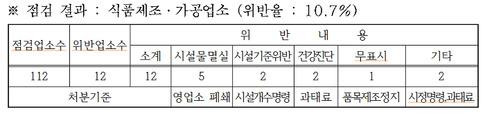 점검결과 시설물 멸실 5개소, 시설기준 위반 2개소 등 12개 업소를 적발하고 영업소 폐쇄, 시설개수 명령 등 행정조치를 취하였다.