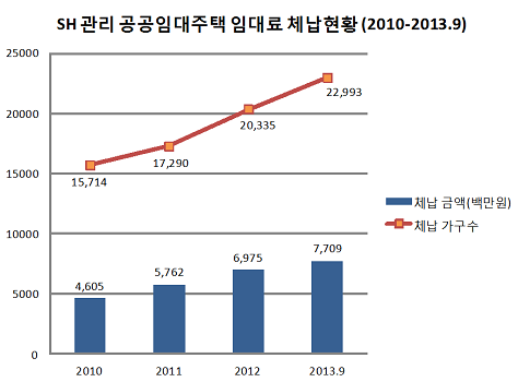 “서민이 살기 팍팍해졌다는 방증” SH가 관리하고 있는 서울시내 공공임대주택의 임대료 체납 가구수가 지난 2010년 15,714가구에서 작년 20,335가구로 29.4% 늘어난 것으로 나타났다.