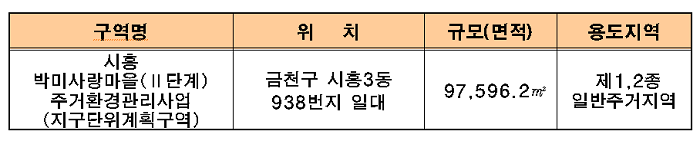 서울시, 전면철거 대신 저층주거지 보존‧정비 ‘주거환경관리사업’ 변경 결정고시 금천구 시흥재정비촉진지구 내 존치지역인 박미사랑마을에 전면철거 대신 저층주거지를 보존하면서도 낙후된 마을 환경을 개선하고 생활‧방범 인프라는 강화하는 주거환경관리사업이 올 연말까지 완료된다.
