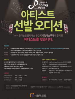 서울지하철 1~4호선을 운영하는 서울메트로는 지하철 예술무대에서 공연을 통해 시민들에게 즐거움을 선사할 ‘2014 서울메트로 아티스트’를 2월 17일(월)까지 모집한다고 밝혔다.