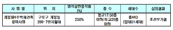 서울시는 2월 19일(수) 제3차 도시계획위원회를 열고 용적률 완화 결정을 위한 구로구 개봉제4주택재건축 정비구역 변경지정(안)에 대하여 주민공동시설의 위치를 재검토 하는 것으로 ‘조건부 가결’ 시켰다.