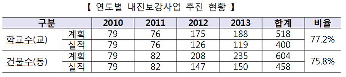 교육부와 교육청에서 조사한 결과 학교시설에 대한 특별교부금이나 국고지원금 등을 확대 지원하여 내진설계 비율을 높이도록 권고했었으나, 당초 계획에 미치지 못하는 것으로 나타났다.
