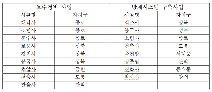 전통사찰은 주로 지어진지 약 100여년 이상 됐고 대부분 목조건물로 지어졌다. 촛불, 연등 같이 불을 사용하는 행사가 많은 만큼 화재가 발생하면 건물 및 문화재 소실 위험이 도사리고 있는 실정이다. 이에 서울시는 소중한 전통 문화유산을 보존‧계승해 미래 세대에 전해준다는 목표로 정부(문화체육관광부) 및 25개 지자체와 함께 '97년부터 보수사업을 연차적으로 시행하고 있고, '12년부터는 방재시스템 구축사업도 함께 추진 중이다.