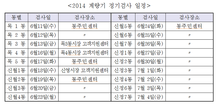 양천구는 오는 6월 11일부터 7월 18일까지 동주민센터를 순회하며 정기검사를 실시한다. 계량기 정기검사는 계량에 관한 법률 제32조에 따라 2년에 한 번씩 실시하는 것으로 대상계량기는 거래 또는 증명용으로 사용하기 위해 보유 중인 ▲판수동 저울, ▲접시지시 및 판지시 저울과 전기식 지시 저울유류거래용 눈새김 탱크 등이다.