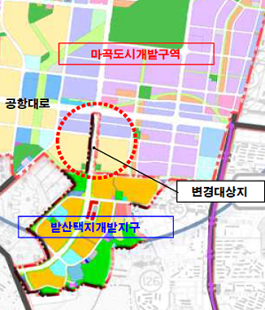 금번 변경은 발산택지개발지구와 연접되어 개발되고 있는 마곡도시개발구역 토지이용계획과의 연계를 위해 수명로변 완충녹지를 도로 및 연결녹지로 변경하는 내용이다.