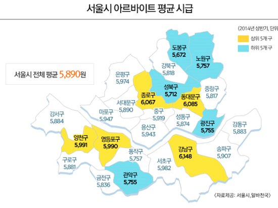 서울지역 아르바이트 평균시급 최저임금보다 680원 높아
