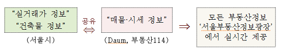 이를 위해 서울시는 민간부동산포털 부동산 114, Daum과 각 기관이 가진 부동산 정보를 실시간으로 연동해 공유하는 시스템을 구축 완료하고, 9월1일부터 본격 시행한다고 밝혔다. 서울시는 부동산 거래신고에 의한 실거래가 및 건축물 정보를 부동산 114와 Daum에 주고, 부동산 114와 Daum은 매물‧시세 정보를 서울시에 제공하게 된다.