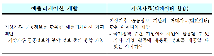 홈페이지 공개를 통해 사업화될 수 있는 환경 지원 기상청(청장 고윤화)은 기상기후 공공정보를 활용한 애플리케이션을 기획하는 ‘애플리케이션 개발’ 부문과 거대자료(빅데이터)를 사회, 경제적으로 활용하는 아이디어를 제안하는 ‘거대자료(빅데이터) 활용’ 부문으로 나누어 정부3.0 기상‧기후 공공데이터 활용 아이디어 공모전’을 개최한다고 11일(목) 밝혔다.