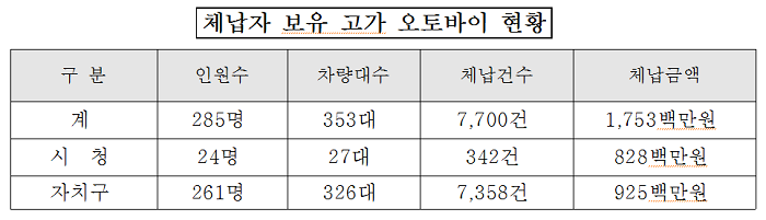 오토바이에 대한 압류・견인・공매는 고액 체납자의 부동산, 자동차(4륜), 공탁금, 예금 등을 압류하는 기존의 체납징수 방식에서 한층 확대한 것으로, 전국 최초다. 최근 오토바이가 이동 및 생계수단이 아닌 레저 또는 스포츠용으로 고가・외제 오토바이 사용이 급증해 가격이 고가화되고 있는 추세지만, 그동안 체납 징수 사각지대에 놓여있었다. 강제집행 대상자는 시세 1백만원 이상을 체납한 사람 가운데 고가로 분류되는 120cc 이상 중・대형 오토바이를 소유한 285명이다. 이들의 누적 체납액은 총 17억5,300만원(7,700건)에 달한다.
